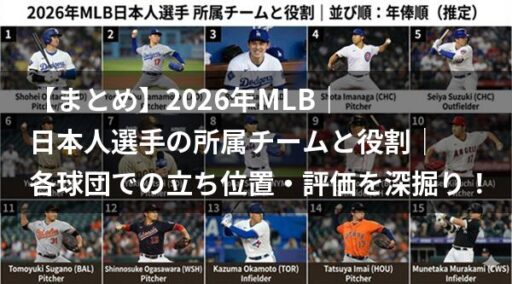 徹底解説!2026年MLB日本人選手の全所属チーム、年俸、各球団での役割を完全網羅。大谷翔平、岡本和真らスター選手の最新動向や注目対決、観戦ポイントも深掘りし、歴史的シーズンに備えよう。 -