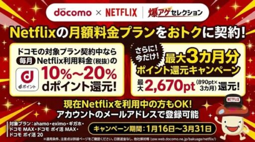 | 爆アゲ×Netflix | 毎月10〜20%分のdポイント還元 | NTTドコモユーザー |